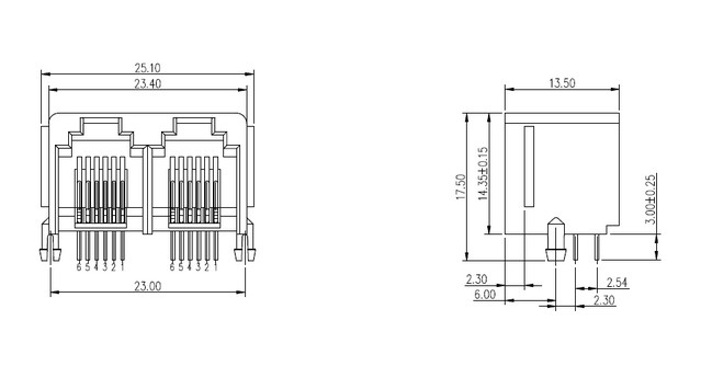 Modular Jack, RJ11, 1*2 ports Contacts: 6P6C / 6P4C / 6P2C Tab up, without panel stops, through hole, side entry